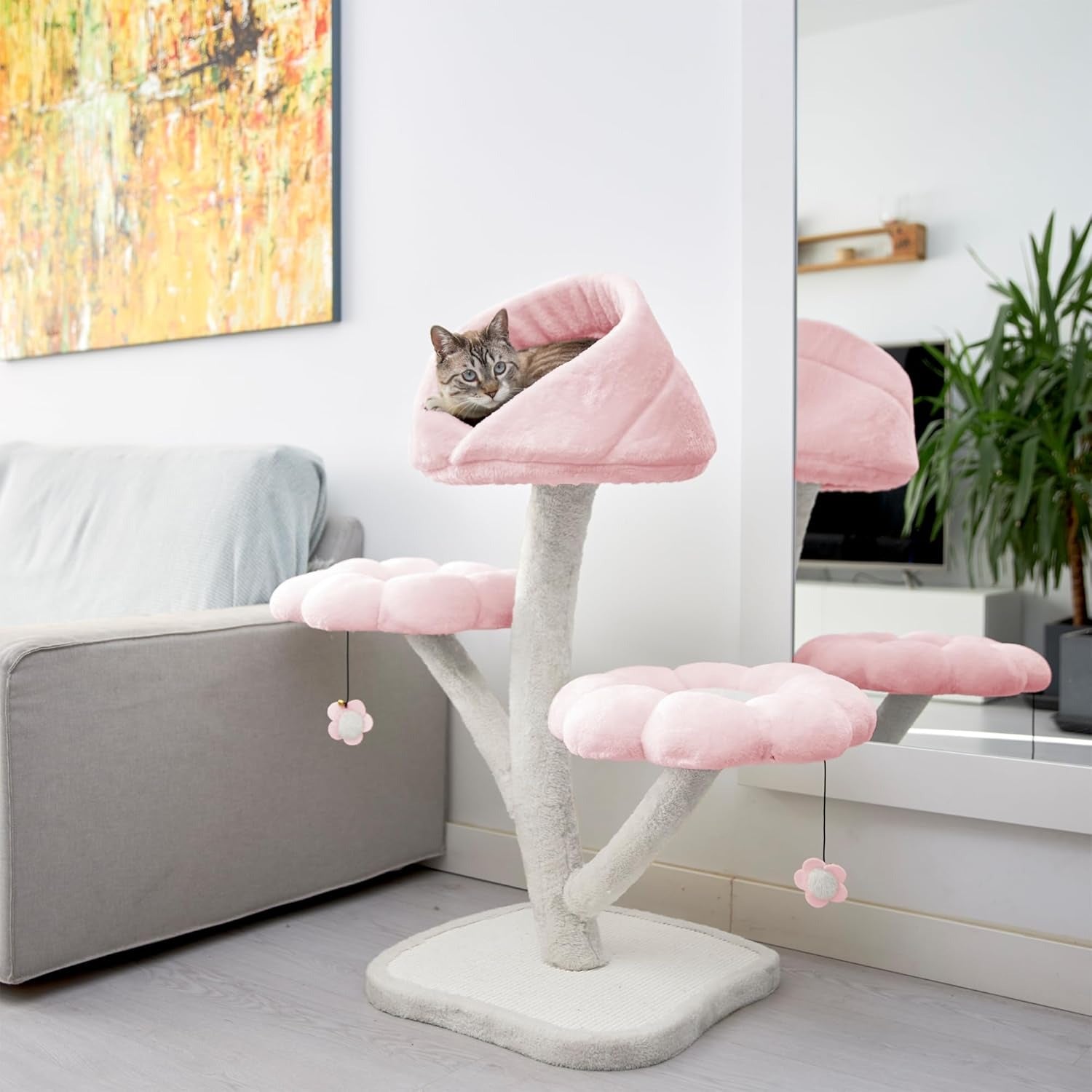 Flower Cat Tree Tower – Multi-Level Condo with Perches & Scratch Pad (Pink)
