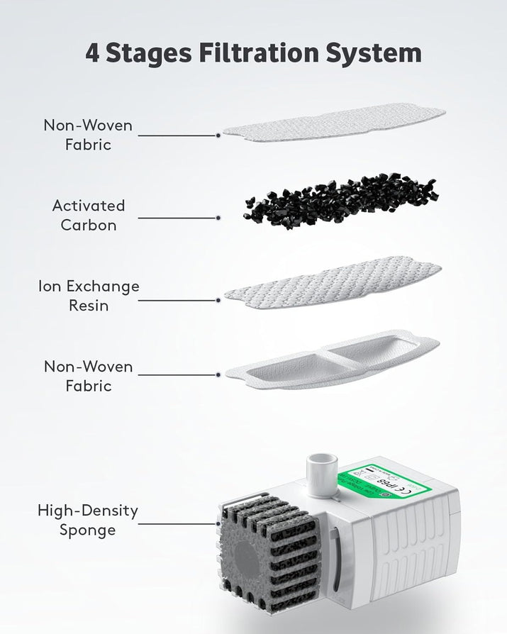 Answer 3: The upgraded pump operates at a very quiet 23dB, making it nearly silent and not disturbing your pet or household. It runs on a low-voltage 5V system, making it energy efficient and safe for continuous use.